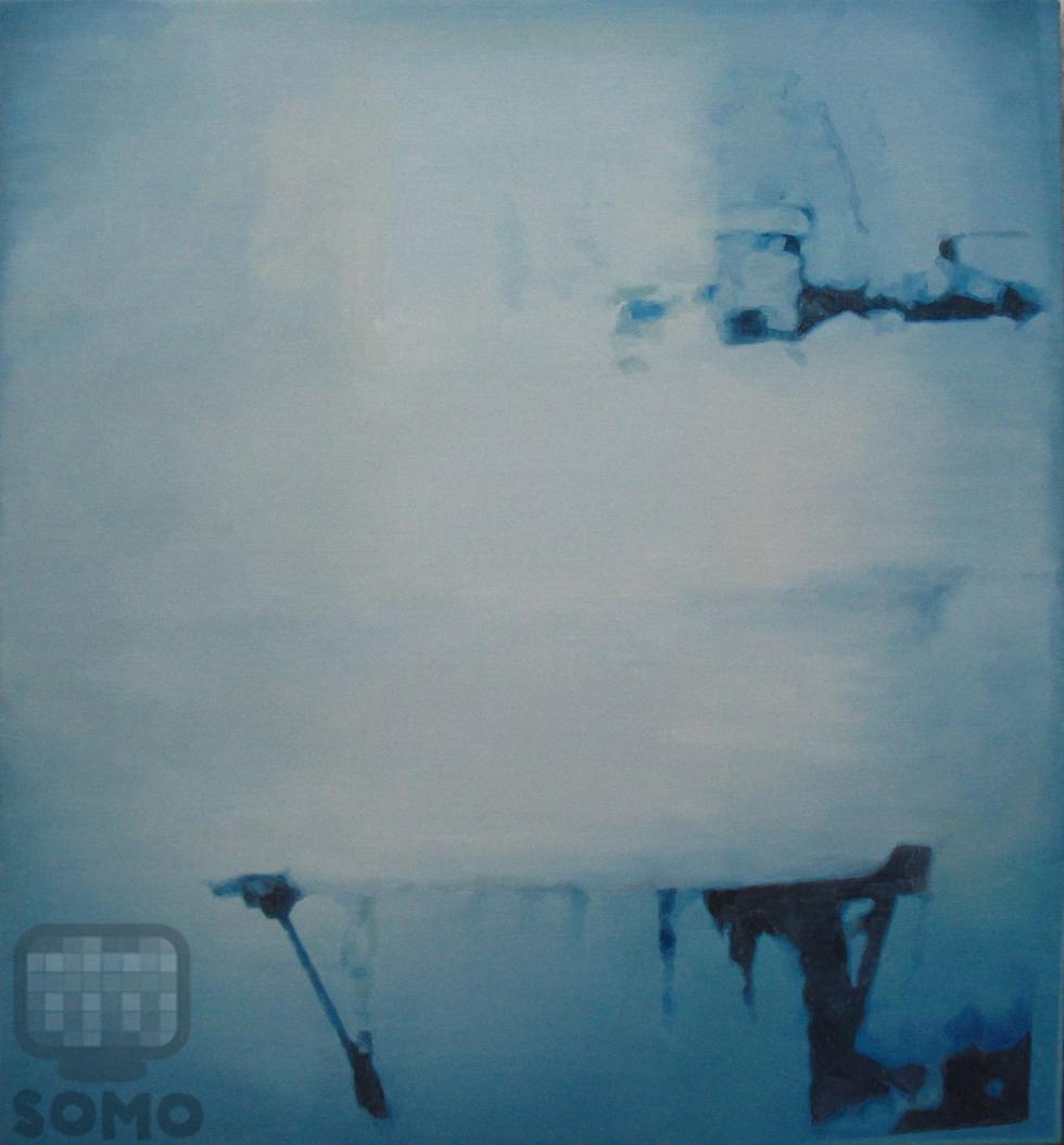 这副作品抽象到让观者只能从名称来了解它的出处。“视觉阅读经验的多次方之水槽11号”告诉观者画布上那些深色和浅色的蓝描绘的是一个平凡的日常物体:接雨水用的水槽。但是,一个实实在在,看得见摸得着的物体是如何变成一个双色的抽象图形的呢?画家王春黎从生活中周围的日常场景入手选择图像,为其拍照。这一举动被无数次重复,整个行动是一个削减的过程,一个将原作和其复制品的视觉区别放大的过程。最后,王春黎把最终呈现的图像画出来,由此对图像进行最后的重建,并追寻图像褪变后仍保有的情感。